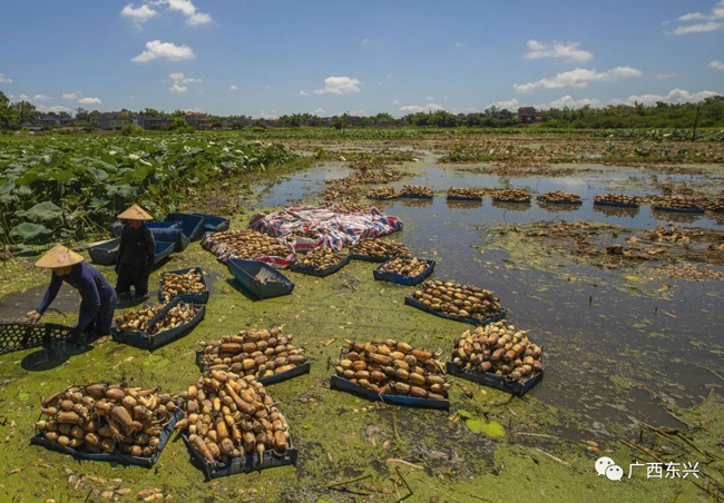 赏完映日荷花,喜迎莲藕丰收。七月盛夏,正是莲藕上市时节,东兴市江平镇长山村的藕塘迎来采收季,藕农们正紧锣密鼓地采挖莲藕供应市场。