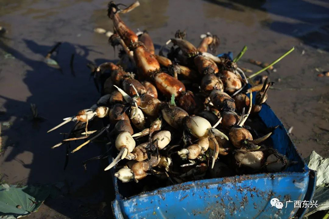 “挖藕是个技术活,挖不好的经常会挖断,挖破皮或者灌泥,一旦出现这种情况就很难卖出个好价钱。”基地负责人唐维神介绍说,自己是湖南人,当了解到长山村周围地势集中连片,水资源丰富,十分适合莲藕生长,便来到长山村通过租用村民土地,发展莲藕种植产业。基地共有50亩藕塘,根据莲藕长势预计能收获40吨左右,现在一天大概能采收4000~6000斤,采收后的莲藕分别售往南宁及周边地区。