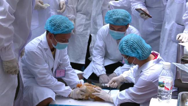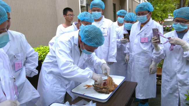 在竞赛现场,参赛选手身着白大褂、戴着口罩和手套,严格遵守竞赛规则,操作动作精准快速、娴熟谨慎,依次进行猪瘟疫苗免疫注射、鸡翅静脉采血、鸡心脏采血及鸡体解剖与采样等技能操作。