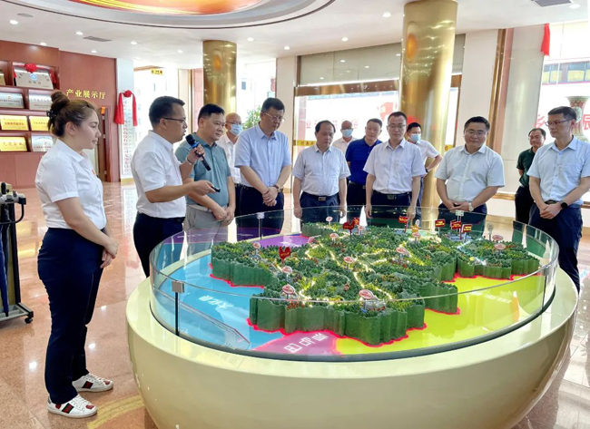 通过沙盘模型深入了解富鹏鸡产业核心示范区实现平果市12个乡镇养殖全覆盖及产业化带动百色市各区县发展情况。