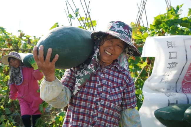 前来务工的农妇面带笑容地说道,一个冬瓜重量在30公斤左右,一个冬瓜差不多可以卖一百多元。虽然采摘、搬运冬瓜是体力活,但有一定的收入补贴家用,她感到很满意。