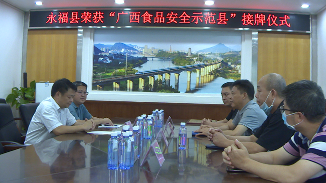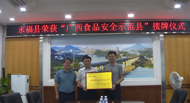 近日,自治区食安委全体(扩大)电视电话会议传出喜讯,永福县获得“广西食品安全示范县”称号。桂林市市场监管局副局长蒋以宏为永福县授牌,县委常委、常务副县长秦传志及县市场监管局相关负责同志参加仪式。