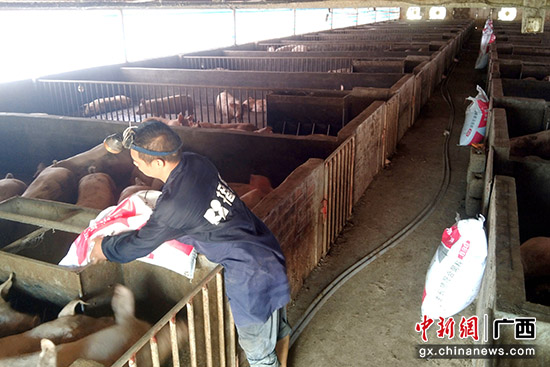 近日,罗城仫佬族自治县天河镇屯相村,养殖户韦明锋正在自家养猪场里劳作。
