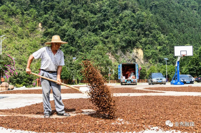 眼前罗运村横村屯的盘春凤正在晒场上晒八角,由于今年八角市场价格坚挺,盘春凤嗅到了商机,在周边做起了八角收购的生意,成了罗香乡八角收购商其中的一员。