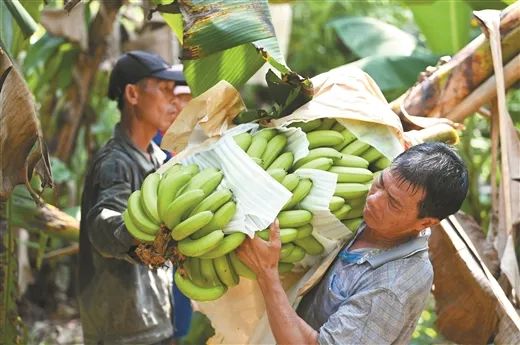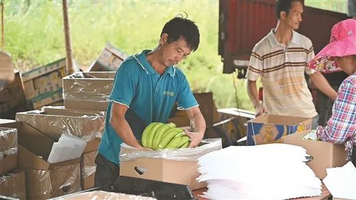 瞧!四五米高的香蕉树上垂吊着一大串色泽光亮的香蕉,沉甸甸的果实让香蕉树“弯了腰”,一幅丰收图景让人喜上眉梢。香蕉林里,两两村民相互配合,“咔嚓”一声,香蕉成串被割下,落在村民的肩上。随后,香蕉被搬运到路边的收购点,进行整理、清洗,加垫减震模后,被整箱打包装上大货车。