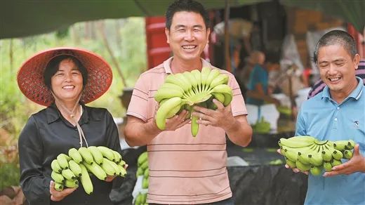 基地负责人彭丽群说,香蕉园种植的巴西蕉品种果穗均匀、果形较美,目前已进入丰收季,每亩产量达3750公斤,亩产值约1万元。