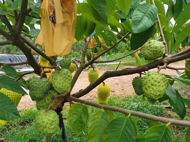 释迦果是近几年逐渐被高端市场认可的水果。博白县有种植释迦果天的地理气候条件优势,是广西首个在山地丘陵大面积成功种植的地区。在广西农科院园艺所方仁博士及黄伟雄主任的指导下,凤梨释迦果通过产季调节技术在博白县成功引种,从果树育苗、移栽、施肥、病虫防控、管护等方面进行技术指导和技术服务,促进释迦果产业提质增效。东平镇蒙庄农业基地负责人蒙朝枢就是其中的受益者,在农艺师技术指导下,蒙庄农业种植的凤梨释迦果品质得到大大的提升,今年是第二年大规模挂果,采取订单式销售,实现了收入倍增,目前已经接收了20万的订单,全部卖出预计可收入320万元。