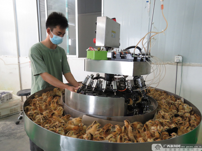 技术员正给鸡苗打预防针。