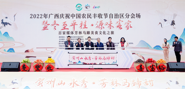 12月9日,2022年广西庆祝“中国农民丰收节”自治区分会场暨冬至平桂·源味客家——百家媒体芳林马蹄美食文化之旅启动仪式在广西贺州市平桂区沙田镇龙井村龙景玫瑰园举行。活动在现代舞《刀耕火耨》中拉开帷幕,现场通过央视频客户端、广西视听客户端等融媒体平台进行网络现场直播,吸引了来自全国各地的众多网友在线观看。