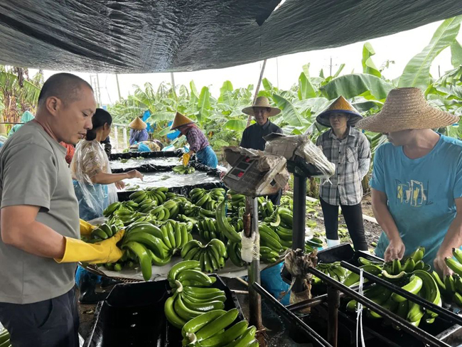 近日,合浦县山口镇新圩村的合浦火山果蔬种植示范区的香蕉基地里,“蕉”香四溢,工人们正忙着采收,一派丰收的景象。