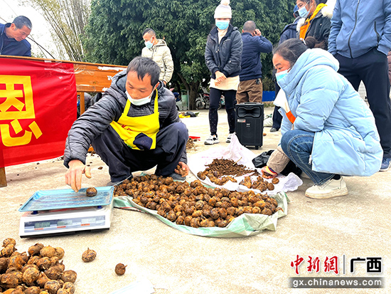 “这袋马蹄比上一袋重,下一袋快来上秤!”在桥圩镇新垌村党群服务中心门前,村民们正在有序地将自己手中的马蹄进行称重,现场热闹非凡。