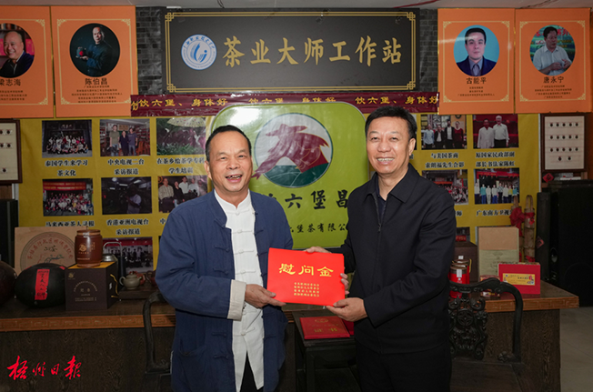 六堡茶制作技艺自治区级代表性传承人陈伯昌致力于传承和发扬六堡茶制作工艺,弘扬六堡茶文化,讲好六堡茶故事。在六堡茶历史文化展示馆,蒋连生看望慰问陈伯昌,感谢他对六堡茶产业发展的支持和对六堡茶制作技艺传承发展作出的贡献。蒋连生说,当前正是六堡茶产业发展的关键时期,希望陈伯昌发挥“大师工作室”作用,培养更多专业制茶人才,持续提高标准化生产水平,加强与龙头茶企合作,推动传统工艺实现高质量传承发展,带动茶农增收,助力乡村振兴。