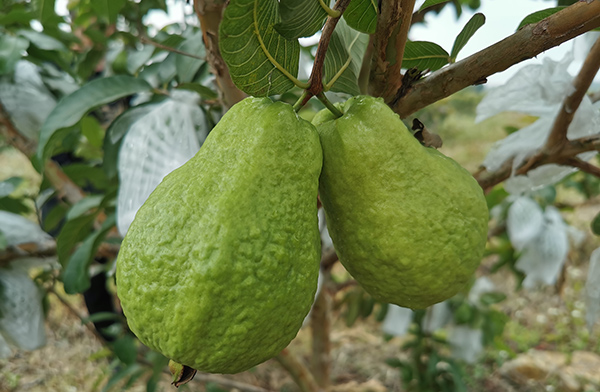 在新盆村下坝屯,一棵棵半人高的红心番石榴枝繁叶茂,一只只套在泡沫网和塑料袋里的果实,和正在开花结果的小石榴一同挂在枝头。据管护人员介绍,红心番石榴在花谢后果实长至直径为3cm左右时,会进行择优疏果,根据树体营养及挂果状况每枝保留1—2个品相佳的良果,再用泡沫网和塑料袋套上,以保持果皮美观、细嫩和防病虫。