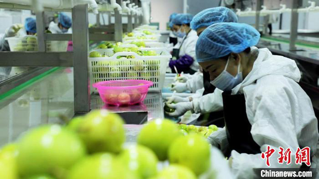 在凭祥边境经济合作区友谊关工业园的广西竣壹农业科技有限公司生产车间里,空气中弥漫香甜的果味。数十名工人正忙着将3吨黄金百香果通过全自动标准化清洗、消毒、取浆流水线设备,进行全流程生产加工。