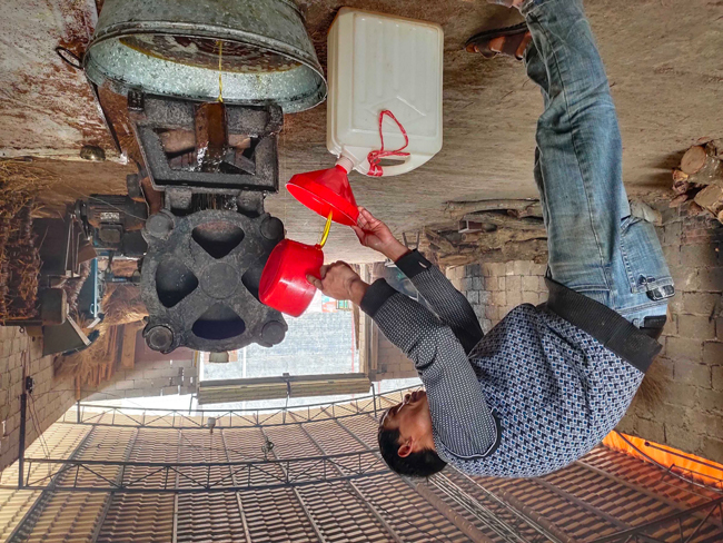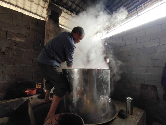 工人将粉碎机打成粉状的茶籽粉放到蒸笼里面蒸熟 莫斌摄