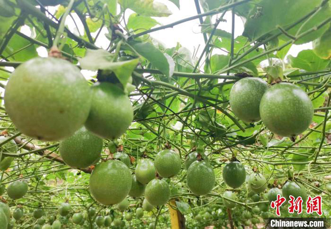 近日,广西百色市隆林各族自治县平班镇平寨村的百香果基地内,条条藤蔓上挂满了百香果,个个果形饱满,令人垂涎欲滴。村民们正在忙着摘果、选果、包装。