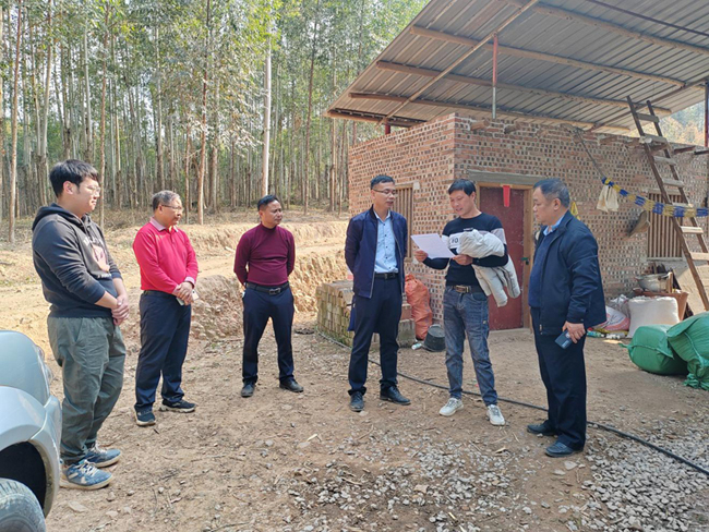 市农业农村局副局长潘登忠(右三)在平桂区望高镇川岩村唐勇林养羊场指导疫病防控