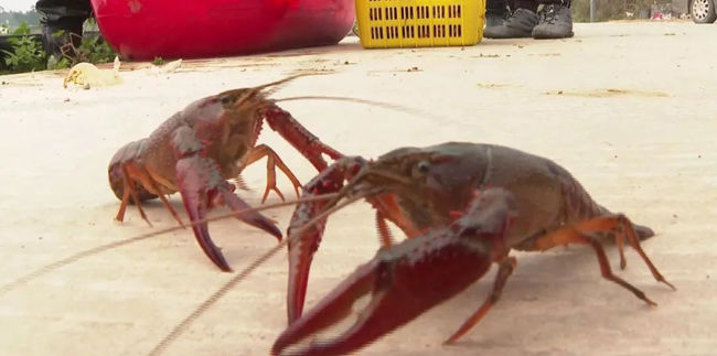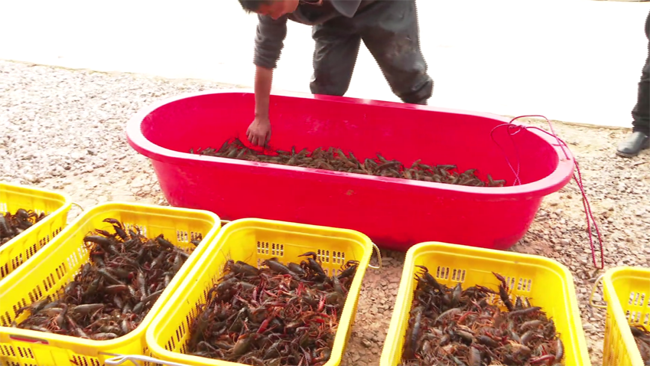 在官成镇横岭村稻虾养殖基地,数百亩稻虾田水草丰富,条块相连,基地负责人正站在水田里拉网捕捞小龙虾,一筐筐小龙虾陆续被捕捞上岸。小龙虾个个活蹦乱跳,膘肥体壮,挥舞着钳子,显得威风凛凛。