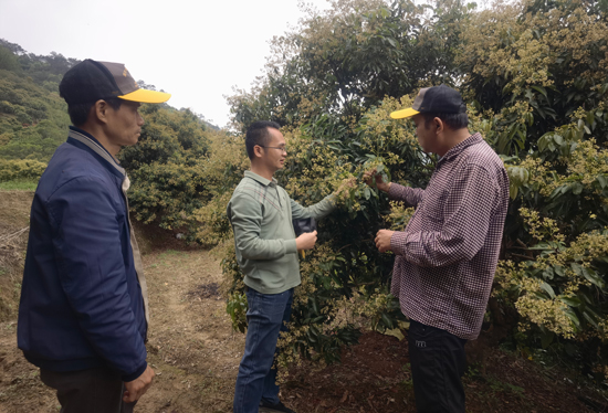 荔花笑春风,果农望丰收。为助力果农做好近期荔枝树管护,确保荔枝丰收到手,连日来,北流市农业农村局领导与农技人员不断地到各地果场调研,指导督促广大果密切关注荔枝开花与天气情况,及时做好保花保果等管护工作、提升座果率,希望果农近期内要千万保护好蜜蜂采蜜和蜂农养蜂积极性,确保花期正常授粉授精;要注意预防荔枝“爆花”,做好水分管理,在遇到30度以上高温天气时,最好每天早上给果树喷洒一次清水,保湿花粉、花蜜,预防果树过度受旱;要在荔花凋谢、蜜蜂撤走后及时喷药杀虫防病、及时喷肥弥补果树开花消耗的养分。