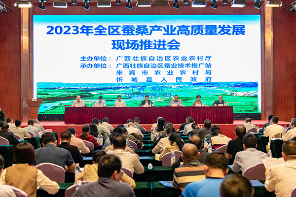 会议指出,蚕桑产业是广西优势特色产业,近年来,在自治区党委、政府的坚强领导和各级部门的大力支持下,产业发展稳中向好,全区蚕业生产区域布局持续优化,形成了以河池市、百色市、柳州市、来宾市、南宁市为主的桂西北、桂中和桂南三大优势产区;产业链条不断完善,一二三产融合发展,特别是在巩固脱贫成果和助力乡村振兴方面成效显著。2022年,全区桑园面积稳定在284.18万亩;蚕茧产量达到43.71万吨,同比增长7.29%。广西蚕茧产量占全国总产量的59.16%,连续18年保持全国第一。全年蚕茧均价47.31元/公斤,蚕农售茧收入206.79亿元,连续两年超200亿元。全区74个县、549个乡镇、4372个村、64.05万农户发展蚕桑生产,规模效益优势突出。