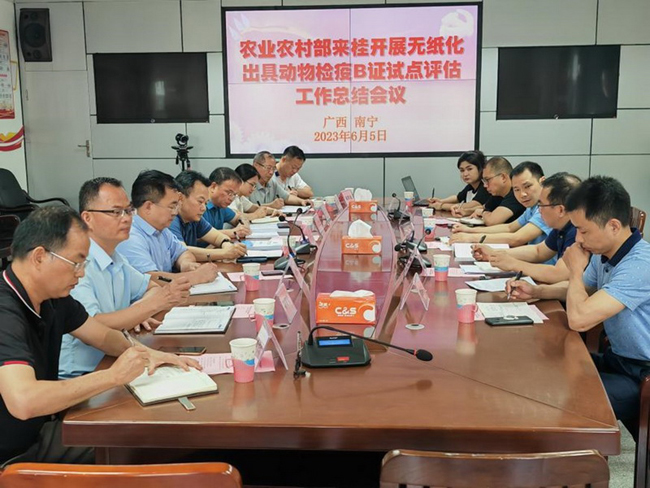 6月2日至5日,农业农村部派出评估专家组对广西无纸化出具动物检疫证明(B证)试点工作情况进行评估验收。