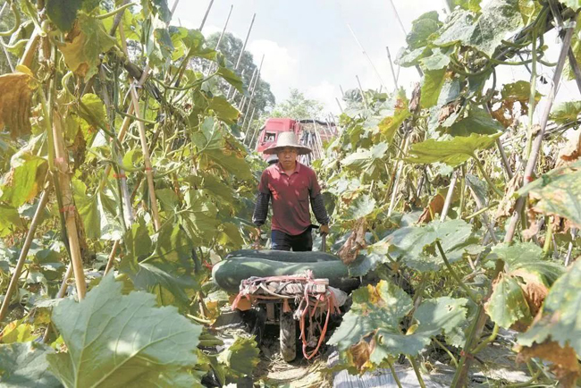 一个个饱满壮硕的黑皮冬瓜缀满藤蔓,工人们穿梭在田地里,忙着采摘、搬运、装车,田地里一派丰收的喜人景象。