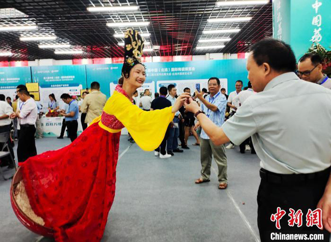 图为一位“不倒翁”小姐姐在邀请嘉宾品尝荔枝。 黄艳梅 摄
