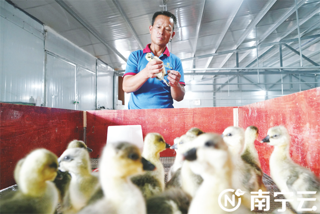 记者在莫群志带领下走进基地宽敞的育鹅房,一只只毛茸茸的雏鹅映入眼帘,很是热闹。“雏鹅出壳后,从恒温房到脱温房再到户外水池,历经一个月就可正常放养。”莫群志告诉记者。2021年9月,莫群志所在的广西马鸿久家禽孵化有限公司在立星村建立肉鹅养殖基地,引进肉鹅“大白鲨”品种开展养殖,刚开始肉鹅存活率不足80%,而前不久刚出售的两批肉鹅存活率已达95%以上。随着基地的养殖设备和技术不断完善,莫群志通过养鹅带领乡亲们致富的信心越来越足。“我们流转了2000亩土地,吸收农户参与,通过土地租金、务工收入、入股分红三大途径促进群众增收,每天带动80多人务工。”莫群志介绍。立星村驻村第一书记黄开睿表示,立星村村级集体经济向该项目投资300万元,每年可从中获得收益金18万元。