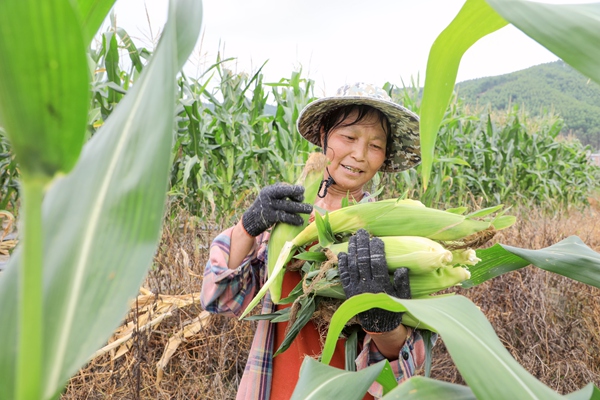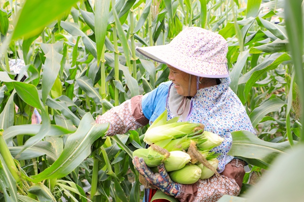 近日,走进南宁市兴宁区五塘镇王竹村周村坡的田间地头,地里的玉米长势喜人。阳光普照大地,清风徐徐吹来,铺展在眼前的是一片果实累累的玉米地,玉米杆随风摆动,散发的清香瞬间扑鼻。饱满的玉米随处可见,挂满枝头,轻轻一掰,不费多大力气便能将成熟的玉米采摘下来。