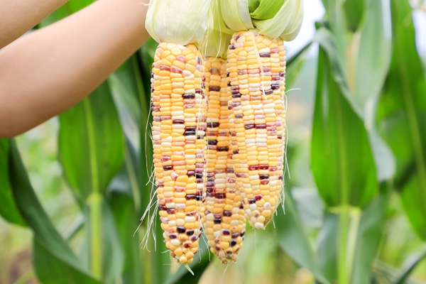 成片的玉米地里,村民们来回穿梭着,手脚麻利地采摘,脸上洋溢着丰收的喜悦。虽大汗淋漓,但热情不减,动作不慢,不一会儿,一整筐的玉米就已经装满了。经过采摘的玉米,村民们会将玉米杆“打褶”,做好标记,方便二次采摘。五彩糯玉米的外衣绿里带着黄,褪去紧实的外衣,就露出了它那红黄相间的果实,粒粒饱满,紧紧挨在一起。