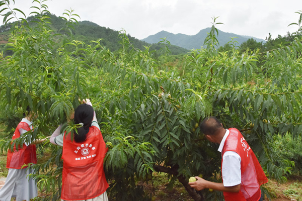 北陀镇志愿者帮助采摘鹰嘴蜜桃。岑祥县摄