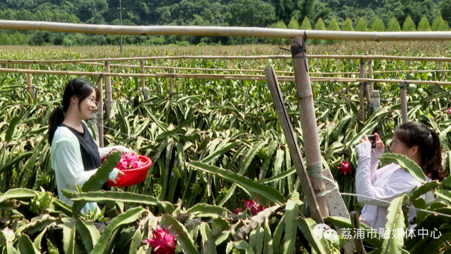 连日来,在荔浦市龙怀乡新安社区红心火龙果种植基地,火龙果长势喜人,一颗颗火红的果实挂满枝头,吸引周边游客前来体验采摘。