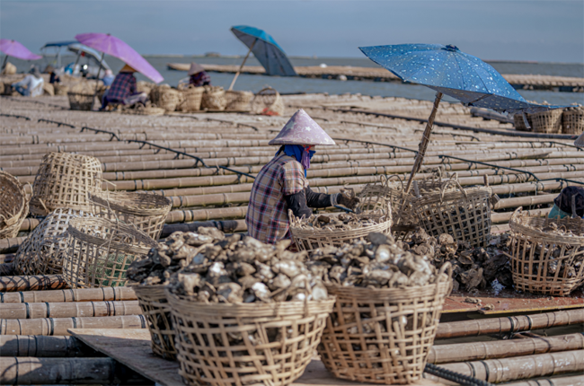▲村民在蚝排上收获生蚝。