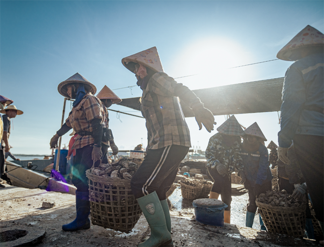 ▲该合作社把刚打捞上来的生蚝运往钦州港售卖。图为钦州港码头热闹的生蚝装卸景象。