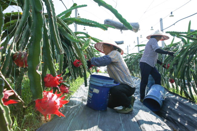 基地负责人杨锦荣说,基地采用有机生态种植模式,采取人工除草、人工授粉,大大提升了果品的安全性,生产的火龙果色泽鲜、果子大、口感好,市场空间越来越大,今年的火龙果更是供不应求。