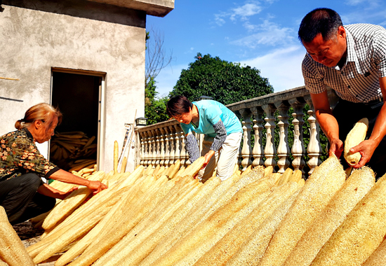 盘建发与家人在翻晒丝瓜络。