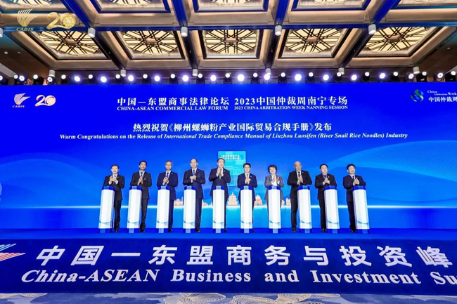 2023年9月18日,第20届中国—东盟商务与投资峰会在南宁升级举办中国—东盟商事法律论坛(以下简称论坛),并作为2023中国仲裁周南宁专场活动。作为论坛重要成果之一,《柳州螺蛳粉产业国际贸易合规手册》正式发布,是广西第一本产业类合规手册。广西壮族自治区党委常委、政法委书记何文浩,中国国际贸易促进委员会副会长张少刚,最高人民检察院副检察长葛晓燕,全国工商联副主席邱小平等领导人员共同见证手册发布。柳州市委常委、柳州市人民政府常务副市长何国烜出席本次论坛。