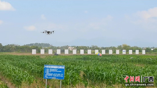 近日,在位于广西贵港市平南县平南街道平田村的玉米大豆带状复合种植基地里,专业技术人员娴熟地操控着植保无人机进行“一喷多促”飞防作业。只见植保无人机腾空而起,给玉米、水稻等作物带来一场及时的“营养雨”。