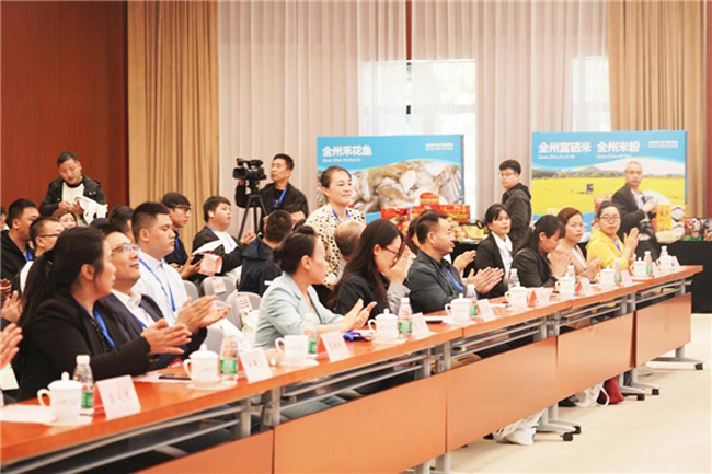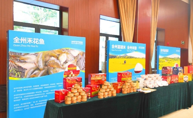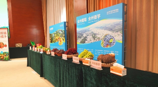 在产销对接会上,播放了全州县宣传片,并授予首批“全州县优质农产品推荐大使”荣誉称号。随后,全州县优质农产品以及企业代表进行了精彩的推介,并举行了现场签约仪式。会场上,商贾云集,宾朋满座,全州优质农产品簇拥亮相,琳琅满目。其中包括全州禾花鱼、全州金槐茶、全州柑橘、全州葡萄、全州富硒米、全州米粉、安和香芋以及东山猪等农副产品,一应俱全,燃爆参会嘉宾的味蕾,这些农产品吸引了与会领导、客商、媒体参观、品鉴和洽谈。