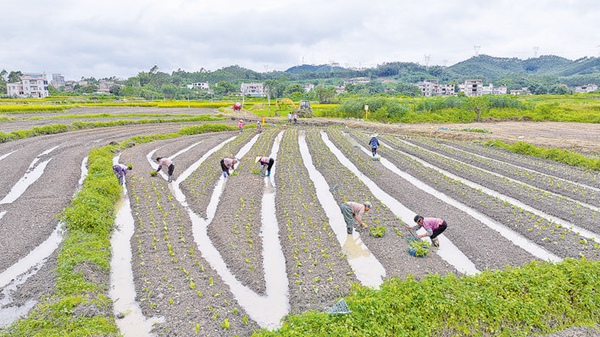 日前,走进玉林市玉州区仁厚镇上罗村,放眼望去,一排排整齐的芥菜苗立在田里,十几位农户正在田间地头忙碌着种植芥菜苗,运苗、分苗、栽种,各项工序有条不紊,呈现出一派繁忙的景象。