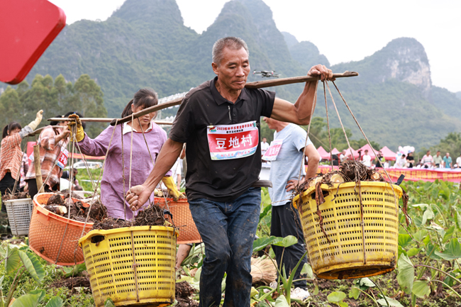芋农将采收芋头挑往赛事区。苏超娟摄