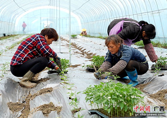 工人栽种辣椒苗。港北区融媒体中心供图