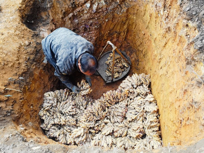 图为欧阳村村民正在装窖贮藏生姜(莫月娇 摄)