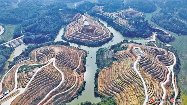 日前,记者来到位于兴业县卖酒镇苍院村的鸿运香柚产业园示范种植基地。只见十多座山岭从上至下被开辟成为带状梯田,四通八达的硬化路连接着每片果林,一批新种不久的果苗长势良好。