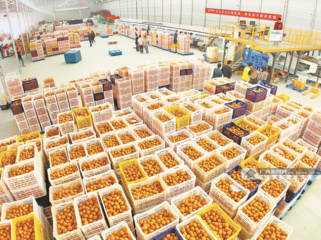 1月1日,2024年武鸣沃柑开市主会场活动在南宁北农产品交易中心举行。图为工人们在智能数字化水果分选中心对沃柑进行分选销售。广西新闻网-广西日报记者 徐天保 摄