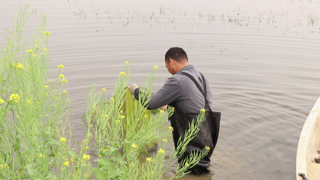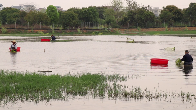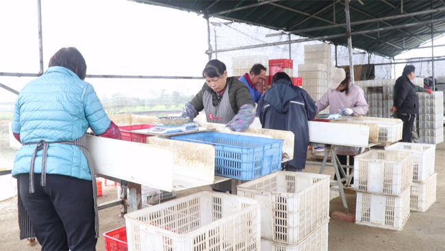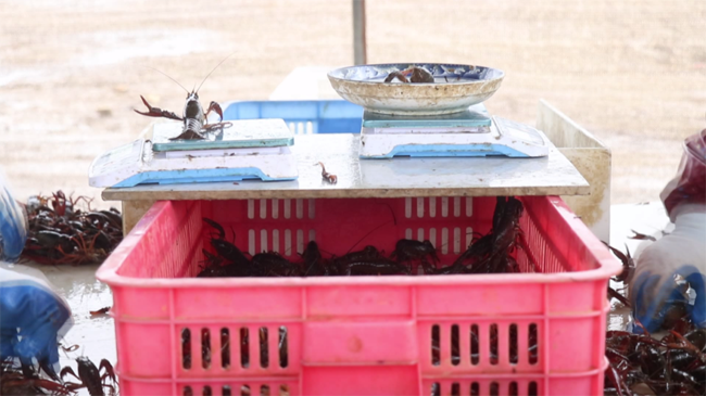 在海川水产稻虾综合种养基地,工人们身穿连体皮衣,熟练地划着小船,捕捞成熟的小龙虾。岸上的工人将一只只膘肥体壮、色泽鲜艳的小龙虾分拣装箱,然后打包后销往上海、南京、深圳、广州等地区,抢着早春上市卖个好价钱。