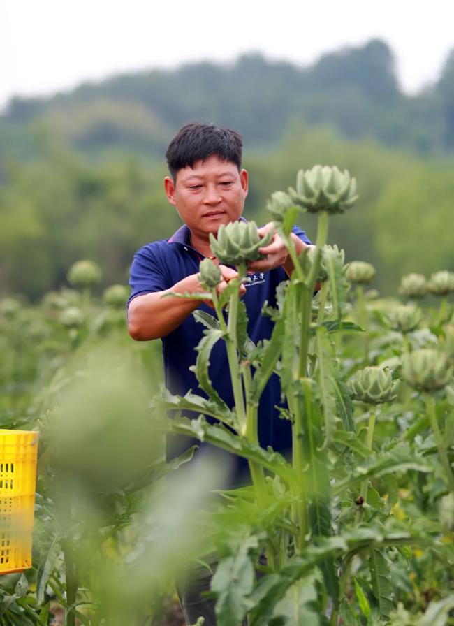 蒋喜明在采收新鲜的洋蓟。