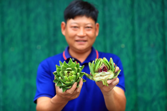 蒋喜明在展示新鲜的洋蓟。