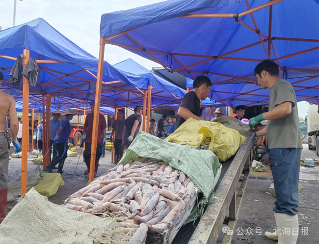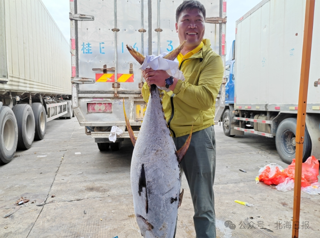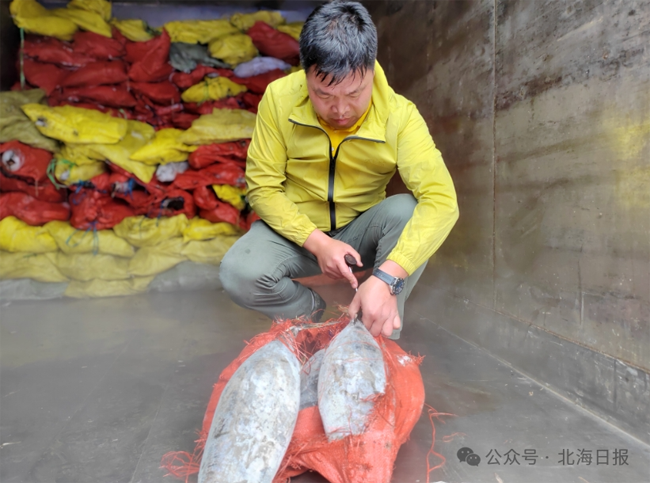 今日下午,记者在南中心渔港看到,隶属北海市银海区泰华渔业发展有限公司的桂北渔某船正停泊在码头边,数十名工人有条不紊地将冷藏在渔船底舱的一托托鸢乌贼(俗称红鱿)、黄鳍金枪鱼等品种的渔获搬运到岸上,然后再码齐装到早已等候在一旁的4辆大型冷链物流车上。该公司副经理朱兵告诉记者,该船载重量1500吨,于今年1月26日从北海出发赴南沙生产,5月15日从南沙返航,19日抵北海,在办完各种相关手续后于今日卸货。估计此次产量达25万公斤,将为北海提供大量海鲜,满足休渔期市民对海鲜的需求。