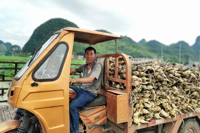 产业振兴助致富,莲藕产业给村民们提供在“家门口”就业的机会。“我平时是做点临时工,到莲藕采挖期开始收购莲藕。今年的莲藕卖价好,品质优,这车大概有2500—2600斤,收购价5元/斤,一天能收5000—6000斤,采挖高峰期每天可收上万斤。”莲藕收购商覃兆卯说道。